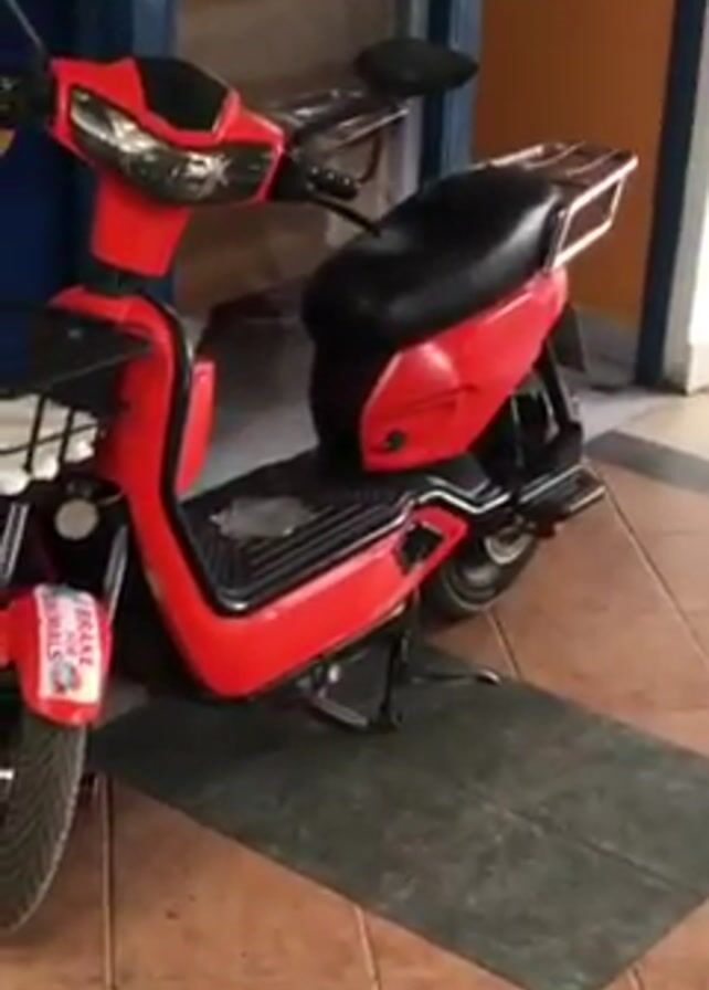 red electric scooter parked on a tiled floor next to a blue framed door. The scooter has a black seat and a silver rack on the back. There is a basket on the front. A small black mat is on the floor underneath the scooter. A sign is visible on the door that says "Printing AVAILABLE."