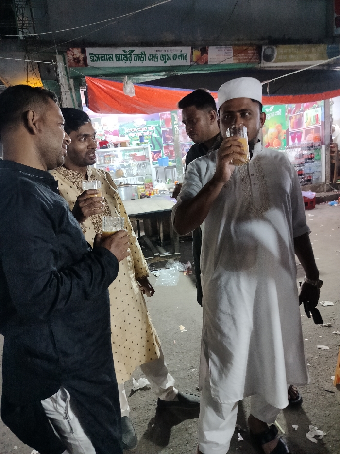 four men standing in front of a shop in Charfasson Sadar, Bangladesh. One man, wearing a white long-sleeved shirt, white pants, and a white skull cap, is drinking from a glass of orange juice. The man to his left, wearing a long-sleeved black shirt and white pants, is holding a glass of orange juice. The man behind him, wearing a light brown long-sleeved shirt and pants with white polka dots, is holding a glass of orange juice, and the man in the back, wearing a black long-sleeved shirt, is looking at the camera. There is a sign above the shop in Bangla. The ground is paved and dirty. There are several plastic bags and other trash on the ground. There are many plastic bottles and other items for sale inside the shop. The scene is dimly lit.
