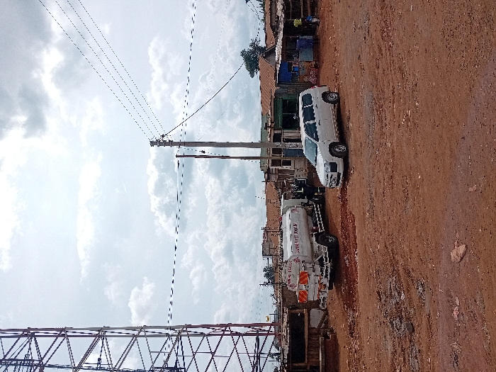 The image displays an unpaved outdoor area in Nyeri, Kenya, under a partly cloudy sky. The ground consists of reddish-brown dirt with visible tire tracks and minor debris. A white tanker truck, marked "JAMAT PETROLEUM LTD" and featuring red and white hazard markings on its rear, is parked facing right in the midground. To its right, a white right-hand drive Toyota Probox station wagon is also parked on the dirt. Behind the vehicles, a line of single-story structures with corrugated metal roofs and walls, consistent with small shops or dwellings, extends across the background. Two wooden utility poles support multiple overhead electrical or communication wires that traverse the scene. On the far left, a portion of a large metal lattice tower is visible. On the far right, near the background structures, two indistinct figures are present, one wearing a blue top. No specific actions or interactions are discernible among the individuals.