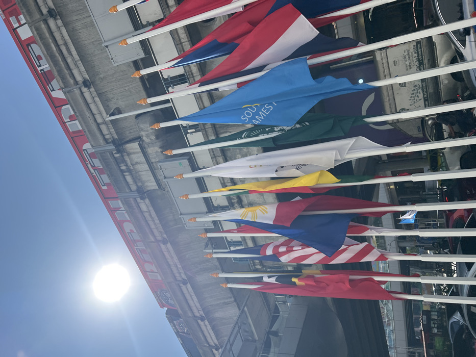 - "A collection of international flags hangs from white poles against a building facade under a bright sky with the sun visible in the lower left" by FM-Nu6Ik2, licensed under CC BY 4.0