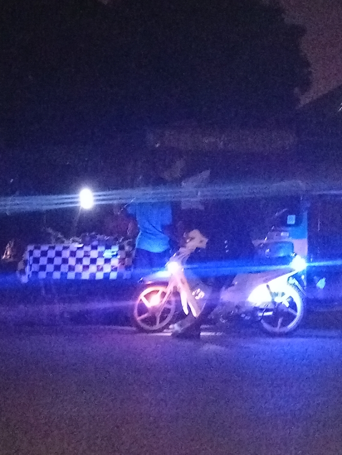 A brightly lit motorcycle is parked on the side of a road at night. A person stands nearby, possibly interacting with a table or food stand covered in a black-and-white checkered cloth. The scene is illuminated by the motorcycle's lights, which appear to be blue and orange, and a nearby streetlight. The background is dark, suggesting it is nighttime.