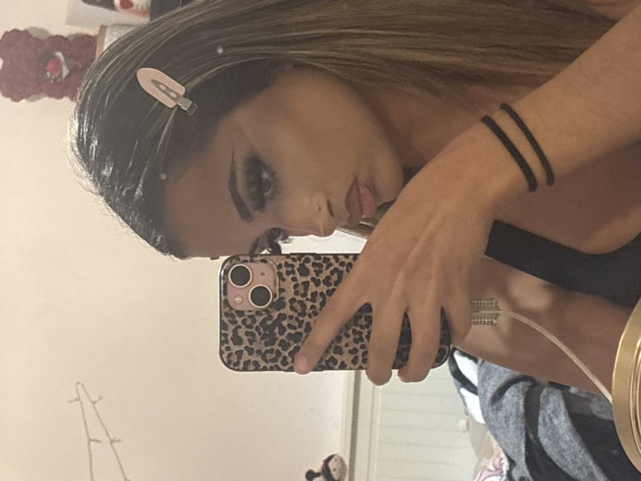 A selfie shows a young woman holding a leopard print iPhone. She has long hair with light highlights and a brown hair clip. Her makeup features winged eyeliner and a nose piercing. Two black hair ties adorn her wrist. The reflection captures a blurred room, revealing a decorative wall hanging, a cable, and a mirror frame.