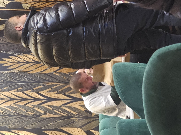 Two men are captured in the image. One, wearing a black puffer jacket and dark pants, stands near a wall adorned with a leaf pattern. The other man is seated on a green chair, sporting a white shirt. The green chair occupies a substantial portion of the foreground. The image is shot indoors with neutral lighting.