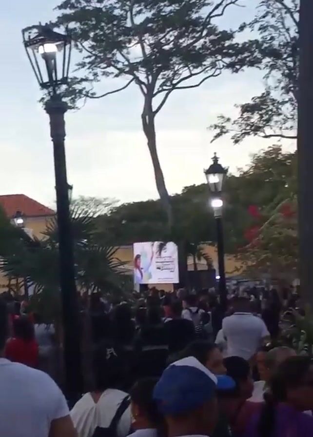 large crowd gathered in a public square, looking towards a stage. Two video screens flank the stage, displaying images, likely related to the event. People of various ages and ethnicities are present, dressed in casual clothing. Some individuals appear to be focused on the stage, while others are conversing or looking around. Tall trees and lamp posts are present, adding to the ambiance of the location. A building in the background has "Museo Nueva" written on it. The lighting suggests it might be early evening. The video captures a sense of community and excitement.