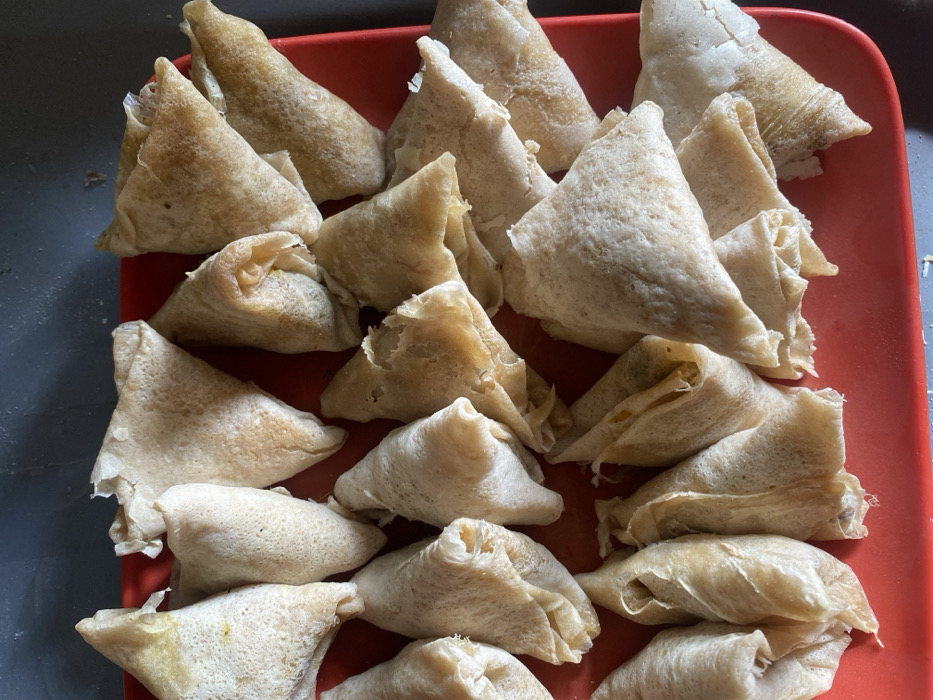 - "A reddish tray is filled with numerous triangular-shaped pastries" by FM-rZumQ2, licensed under CC BY 4.0