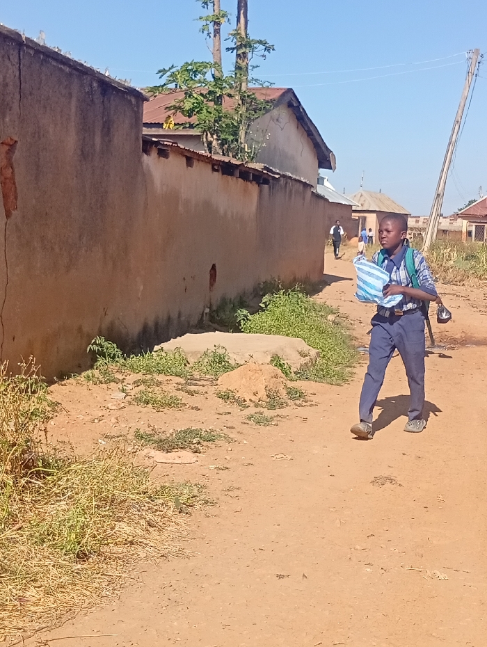 A young male, possibly a student, walks from right to left across an unpaved reddish-brown dirt path in Bukuru, Nigeria, under a clear blue sky