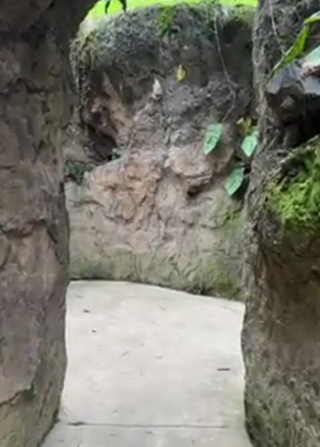 stone tunnel opening into a small circular room with walls made of rough, textured rock. The tunnel entrance is bordered by similar rock formations, some covered in moss and foliage, including green plants with heart-shaped leaves. The floor of the room is a smooth, light-colored concrete or stone surface. The lighting is dim inside the room, with natural light filtering in from above.