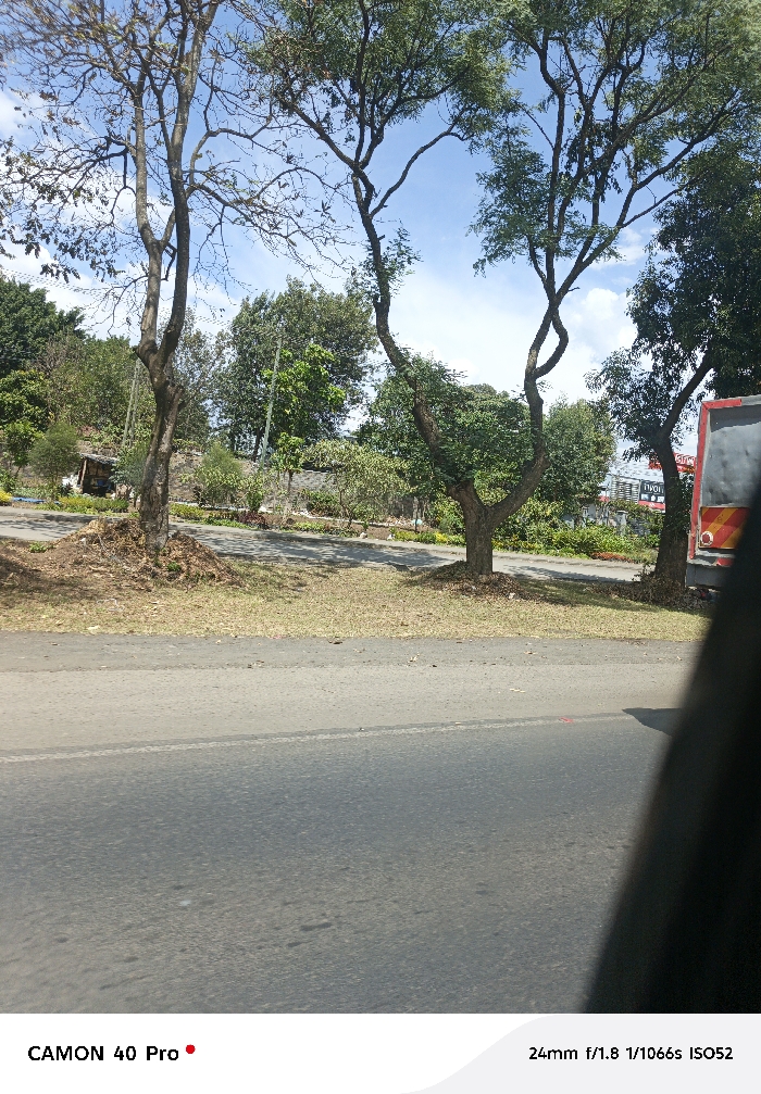 The image displays an outdoor scene under a clear blue sky with scattered white clouds, located in Nakuru East ward, Kenya, as evidenced by a discernible "NAKURU EAST WARD" sign visible in the mid-ground. An asphalt road, featuring a faded white center line, occupies the lower portion of the frame. Adjacent to the road on the right is a median strip composed of dry, light-green grass. Beyond this median, a sloped area is heavily vegetated with numerous trees and shrubs. Two prominent trees with mostly bare, branching trunks stand in the mid-ground, their canopies extending into the sky. Further back, partially obscured by foliage, several structures are visible, including one appearing to be a wooden building with a dark roof. On the far right, the rear section of a large red vehicle, likely a bus or truck, is visible, displaying yellow and red chevron markings. No individuals are present, and no actions or interactions are depicted.