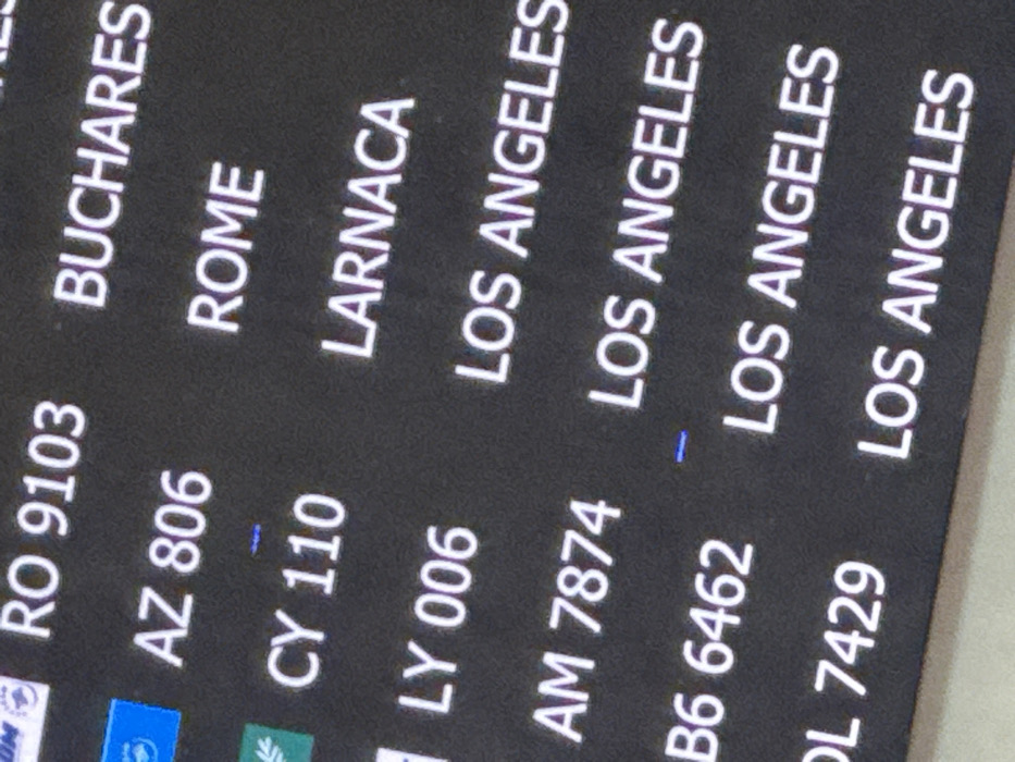 The image displays a close-up, angled view of a digital flight information display board, characteristic of an international airport. The screen features a dark gray background with white alphanumeric text. Visible information includes flight numbers and corresponding destinations. The entries are: RO 9103 with a partially visible destination of BUCHAREST; AZ 806 to ROME; CY 110 to LARNACA; LY 006 to LOS ANGELES; AM 7874 to LOS ANGELES; B6 6462 to LOS ANGELES; and a partially visible OL 7429, also destined for LOS ANGELES. Small blue dashes appear intermittently on some lines, possibly as indicators or display artifacts. Airline logos are partially visible next to RO, AZ, and CY flight numbers. No individuals or external environmental features are visible, focusing solely on the display's content. The scene is located within an airport terminal in Unknown, Israel.