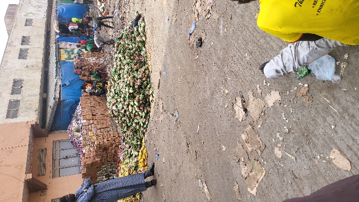 The scene depicts an outdoor commercial or distribution area in Fagge C, Nigeria, characterized by a cluttered environment and active human presence