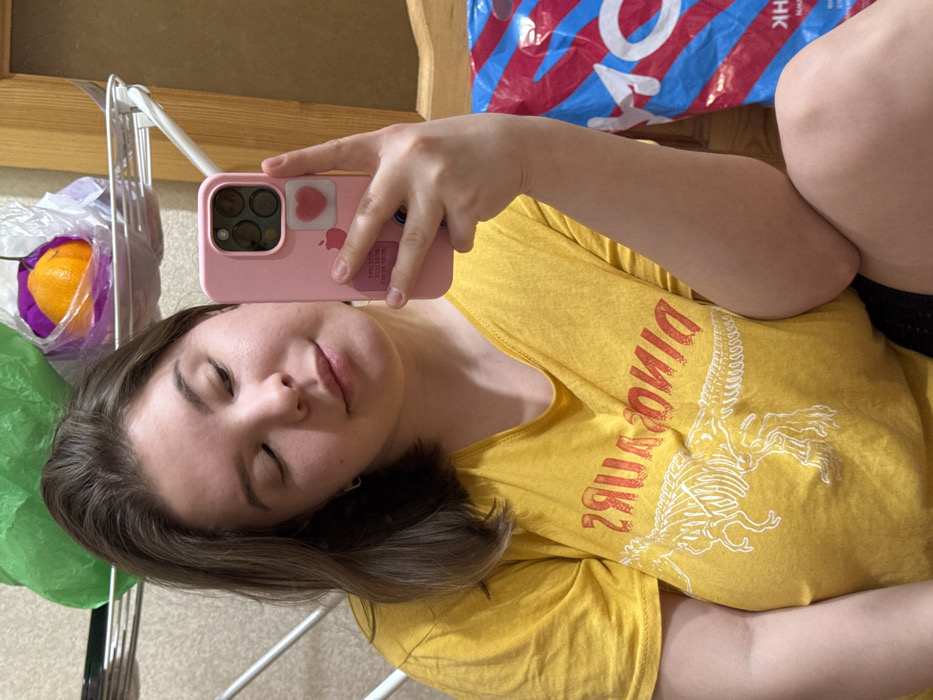 An individual is depicted taking a selfie photograph indoors. The subject is a female with light brown hair, wearing a yellow short-sleeved t-shirt featuring a reversed red text graphic reading "DINOSAURS" above a white dinosaur skeleton illustration. She holds a pink smartphone with her right hand, positioned in front of her, indicating the image is a reflection. The smartphone case displays a white Apple logo sticker and a red heart sticker, along with a rectangular sticker with partially visible text. Her eyes are directed downwards. The background elements suggest a domestic setting. To the upper left, a white wire shelving unit is visible, holding a crumpled green plastic bag and a purple plastic bag containing an orange fruit. To the right of the subject, a light brown wooden door or panel is present. A blue and red striped plastic bag, possibly a shopping bag with partial white lettering, rests on the floor or surface adjacent to the subject's right arm and leg. No discernible visual elements within the image confirm the specific city of Nizhnekamsk, Russia.