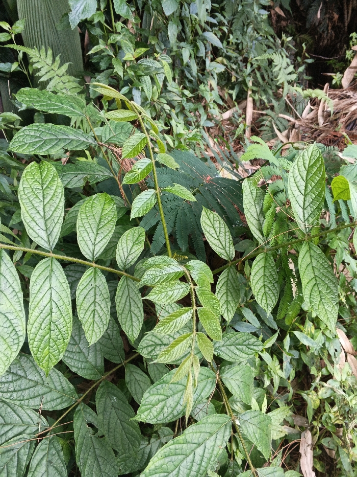 The scene is a dense, natural vegetative area located in the city of Buyantashi, Zambia. The foreground and midground are filled with vibrant green foliage from multiple plant species. Dominating the immediate foreground are stems with compound leaves, where individual leaflets are ovate-elliptic with clearly defined venation patterns. These leaves exhibit a slight sheen. Further into the background, other plant types are visible, including fern fronds and a plant characterized by numerous small, finely divided leaflets arranged bipinnately. The foliage exhibits various shades of green, with some darker, possibly drier plant matter intermingled in the deeper background. No human figures, animals, or artificial structures are present. The ambient lighting provides uniform illumination across the plant canopy.