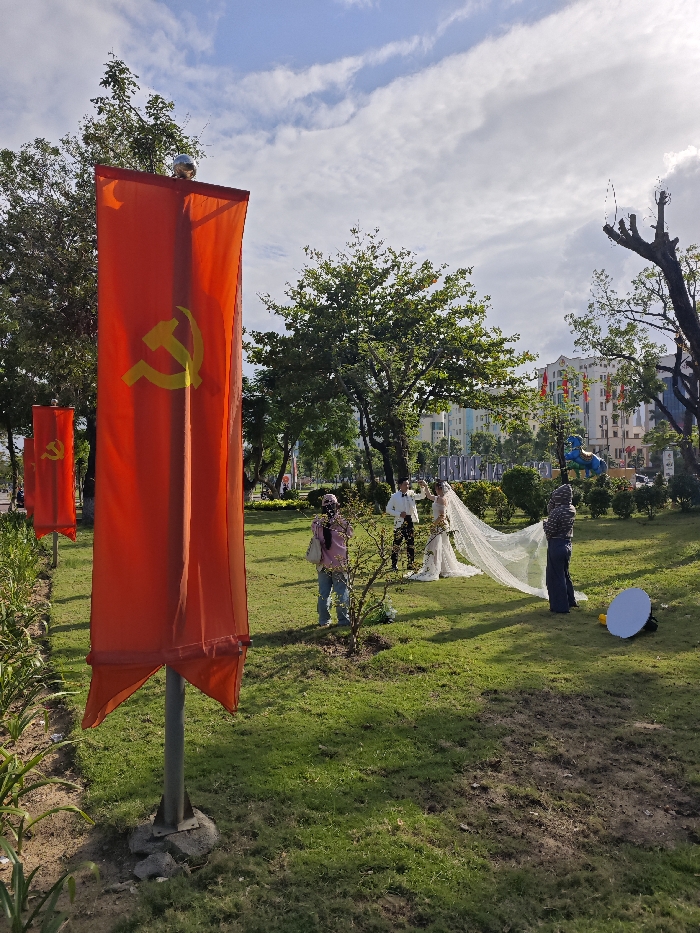 The image depicts an outdoor wedding photoshoot taking place on a grassy lawn in a park setting within Quy Nhon Ward, Vietnam. In the left foreground, a prominent red vertical banner displaying the yellow hammer and sickle emblem of the Communist Party of Vietnam is fixed to a grey pole, topped with a silver finial. A second, similar banner is partially visible behind it to the left. The ground in the immediate foreground consists of sparse grass and dirt. The midground features a wedding couple on a well-maintained green lawn. The bride, in a white wedding gown, has a long, flowing veil trailing behind her on the grass and holds a bouquet of yellow flowers. The groom wears a white suit jacket and dark trousers, and is seen adjusting his tie or hair. Two other individuals are present: one person, dressed in a pink top, blue jeans, and a dark head covering, stands to the left of the couple, appearing to direct them or capture an image. Another person, in dark clothing and a head covering, is positioned to the right of the couple, actively adjusting the bride's veil. On the grass near this individual, a silver circular photography reflector lies flat, adjacent to a yellow object. Numerous green trees with lush foliage are scattered throughout the park, providing a natural backdrop. In the background, several modern multi-story buildings are visible, some with multiple smaller red banners strung between poles. A blue animal statue, possibly a horse, is also discernable near the buildings on the right. The sky is partly cloudy, indicating daylight conditions.