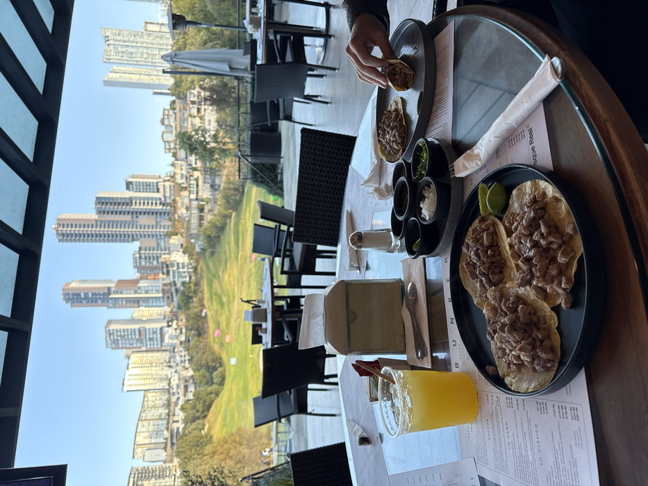 The image depicts an outdoor dining scene on a patio or terrace overlooking a golf course and a dense urban skyline in Interlomas, Mexico, under clear daytime conditions