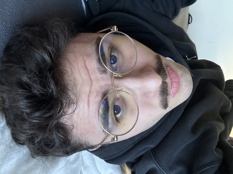 An inverted, head-on close-up depicts a male subject lying on their back in an indoor setting in Rennes, France. The subject wears a dark hooded sweatshirt and round, gold-rimmed glasses. Features include dark, wavy hair visible at the bottom of the frame, pronounced forehead wrinkles, wide-open blue eyes reflecting a light source, a dark brown mustache, and pink, slightly glossy lips. The immediate background suggests light-colored bedding.