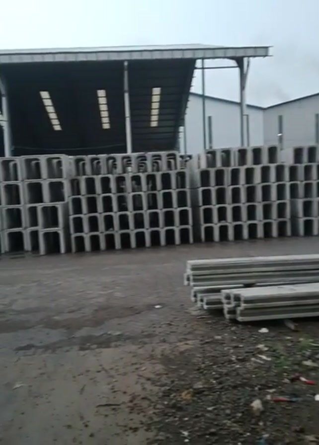 warehouse yard with stacks of rectangular concrete structures. In the center of the view, stacks of gray, hollow, box-shaped concrete segments are arranged neatly. To the right of these stacks are similar but solid, rectangular concrete bars. In the foreground, there’s a stack of wire mesh or reinforcing steel. The ground appears to be wet, with cracks visible in the concrete. In the background, a building with a corrugated metal roof and dark walls with small, rectangular windows can be seen. The sky above is overcast. The camera moves slightly, panning across the scene from left to right.