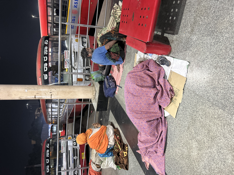 The image depicts a nighttime scene at a bus station in Bengaluru, India. In the foreground, on a grey tiled platform, a person is completely covered by a pink patterned blanket, lying on a mat constructed from cardboard and a white sheet. A single dark slipper rests beside them. To the left, a person, with their back to the viewer, sits on the ground, wearing an orange head covering and white clothing, resting on a brown blanket and an additional white cloth. Another individual lies partially visible under a brown blanket adjacent to them. A prominent concrete pillar stands centrally. To the right of the pillar, a man with dark hair and a beard, wearing a blue t-shirt, sits on the ground, leaning against a bundle or another person wrapped in a patterned blanket. A dark blue duffel bag and a green striped fabric bag are situated near him. A red metal bench or table is partially visible in the far right foreground. In the background, behind a metal railing, multiple red and white Karnataka State Road Transport Corporation (KSRTC) buses are parked. The buses bear Kannada script "ಕ ರಾ ಸಾ ನಿ" (Ka Ra Sa Ni) and destination signs, including "BENGALURU" and "SOMVARPURA / C.G. PURA". A bus driver is visible in the driver's seat of one bus. The scene indicates individuals are resting or sleeping in a public transportation hub.