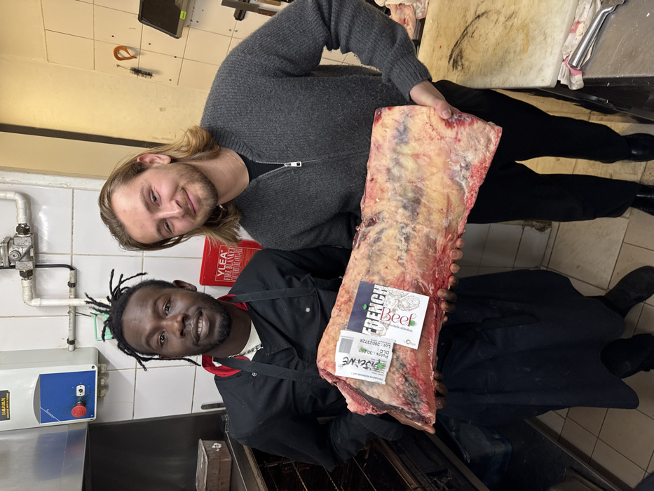Two men hold a large cut of beef. The man in the black apron is in the foreground, smiling at the camera. The other man, wearing a gray sweater, looks at the camera too. The beef has a "French Beef" label. The setting appears to be a professional kitchen, with stainless steel surfaces, tiled walls, and various tools visible in the background.