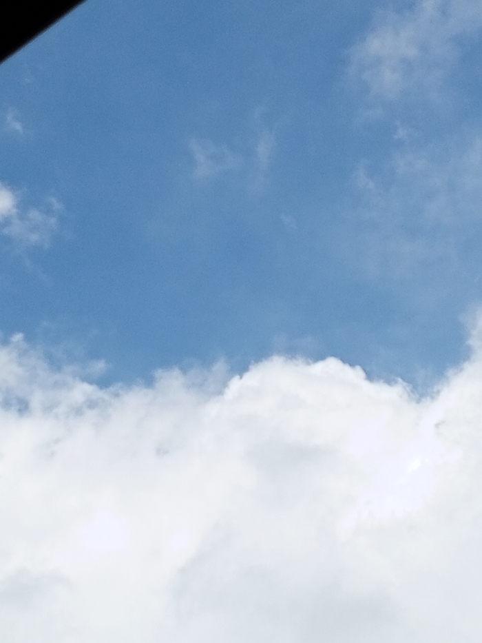 The image showcases a serene sky. The upper portion is dominated by a clear, light blue expanse, sparsely dotted with delicate, wispy clouds. The lower area contrasts with large, fluffy white cumulus clouds, creating a distinct separation between the blue sky above and the cloud bank below. A dark object appears in the upper left corner, partially obstructing the view.