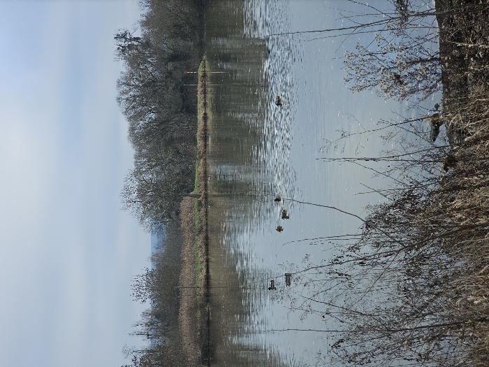 The image presents a tranquil outdoor scene in Bech-Kleinmacher, Luxembourg, featuring a body of water under an overcast sky. In the foreground, a dense array of dry, leafless branches and brown reeds partially obscures the lower portion of the water. Six ducks are visible on the water's surface, swimming amidst subtle ripples and reflections of the sky and surrounding trees. The far bank consists of a narrow strip of dry land covered with light brown grasses and sparse green vegetation. Behind this bank, a dense cluster of deciduous trees stands, mostly bare of leaves, indicative of late autumn or winter. A white and red striped pole is prominently positioned vertically at the water's edge on the far right bank. The distant background shows a faint treeline beneath a pale, light blue to gray sky. No human subjects are present.
