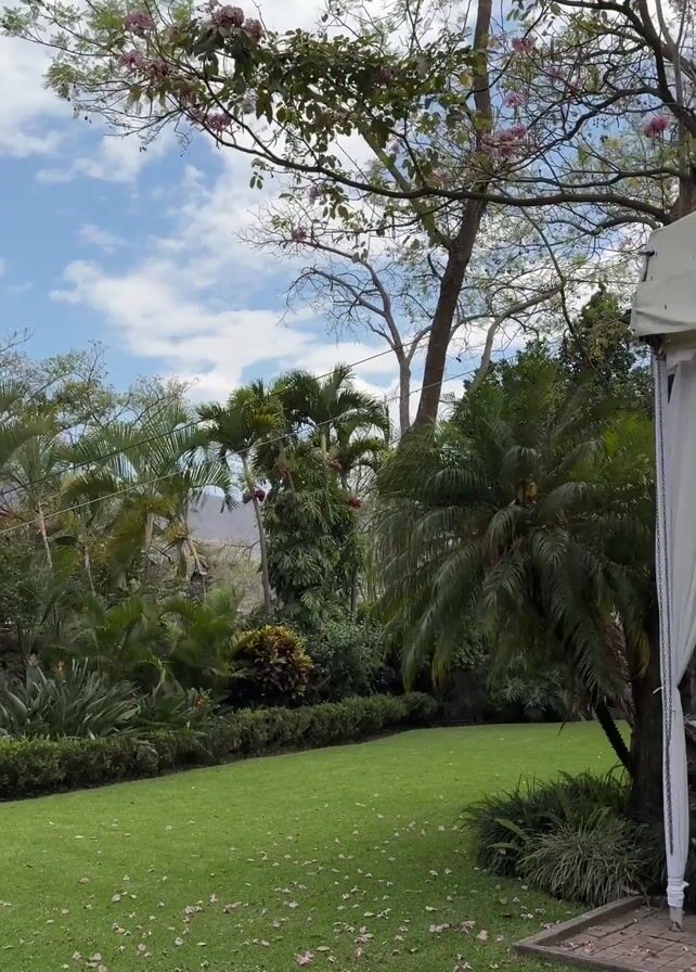 lush outdoor event space under a partially cloudy sky. The foreground features a well-manicured lawn scattered with pink petals, bordered by dense greenery including palms and shrubs. A large white tent with flowing white drapes is visible to the right, partially obscuring the view. Underneath the tent are round tables set for a formal event. There is a DJ booth at the far end. Some people are present, seemingly setting up the event. Lighting equipment sits near the edge of the tent. Tall trees, one with pink blossoms, frame the scene, with a glimpse of mountains in the distance.