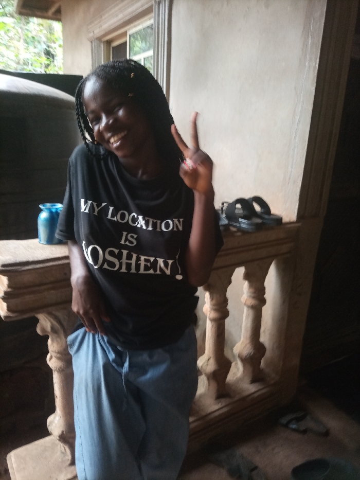 A smiling young woman with braids stands on a porch. She wears a black t-shirt that reads "MY LOCATION IS GOSHEN!" and light blue pants. She flashes a peace sign with her right hand. Behind her is a large water tank, a blue container, and a window. A decorative railing is to her right with sandals on it. More footwear is scattered on the porch floor.