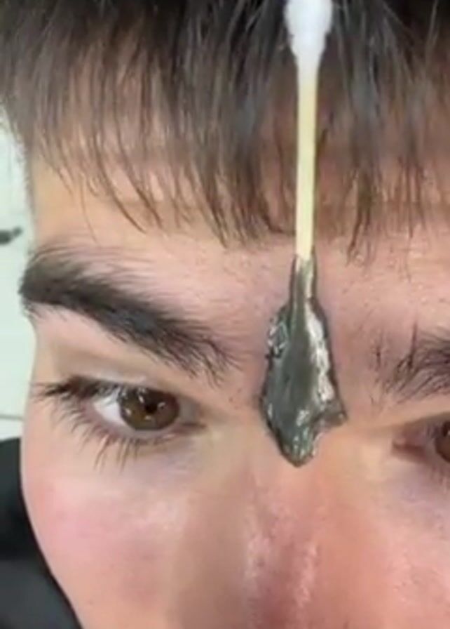 A close-up shot of a fair-skinned man's face reveals a cotton swab vertically attached to his forehead with a dark, viscous substance