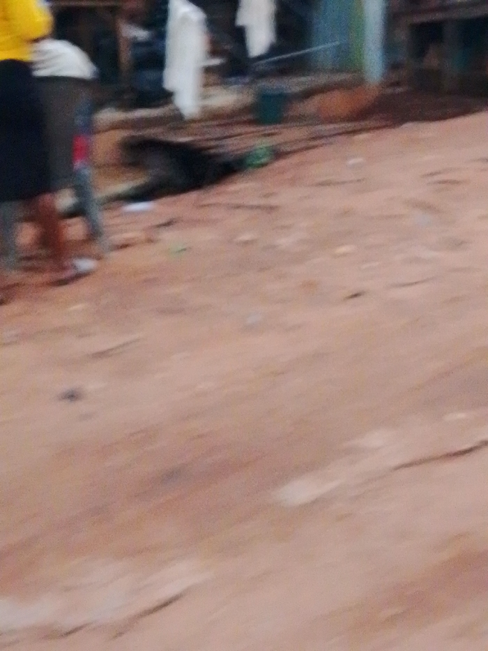 The scene depicts an outdoor area in Onitsha, Nigeria, characterized by reddish-brown dirt ground. The image is significantly blurry. In the left foreground, the lower half of two individuals is visible: one wearing a yellow top and a dark bottom, and another with light-colored trousers and partially visible red footwear. Their actions or interactions are indistinct. In the mid-ground, a dark, elongated object or figure lies horizontally on the dirt. Above this object, several white pieces of fabric are suspended, possibly laundry drying. A dark green bucket is also present in the mid-background. The background consists of indistinguishable structures and general clutter, consistent with an urban or semi-urban environment.