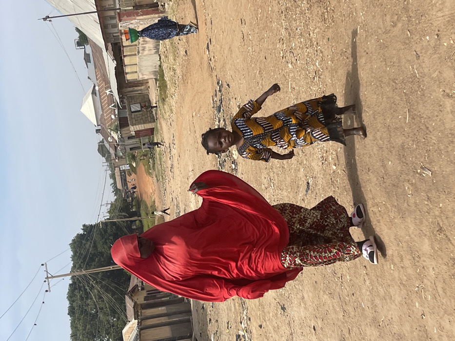 The image depicts an unpaved, dusty dirt road in Muchiya, Nigeria, under a clear, brightly lit daytime sky. In the foreground, an adult female and a young child walk from left to right. The adult female wears a voluminous, bright red head covering and garment that drapes over her body, obscuring most of her face except for the upper forehead. She wears patterned trousers under the red garment and white and pink slip-on sandals. Her right arm is slightly raised, holding the red fabric. The young child, walking barefoot to the adult's immediate right and slightly behind, wears a patterned dress in yellow, brown, black, and white with a dark, ruffled hem. The child faces the viewer directly. The background features a series of single-story residential structures with corrugated metal roofs and walls of various materials, including concrete blocks. Utility poles with overhead power lines are visible along the left side of the road. Further along the dirt road, several distant figures are observable, including one individual in the mid-ground on the right, carrying a stack of green and orange bowls on their head, partially covered by blue patterned fabric. Scattered dry vegetation and minor debris are present along the roadside.