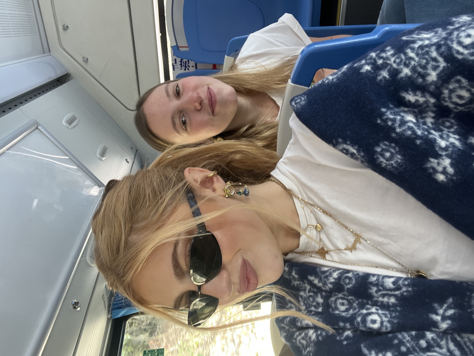 Two fair-skinned women pose in a bus or train interior, one partially obscured by a blue patterned blanket