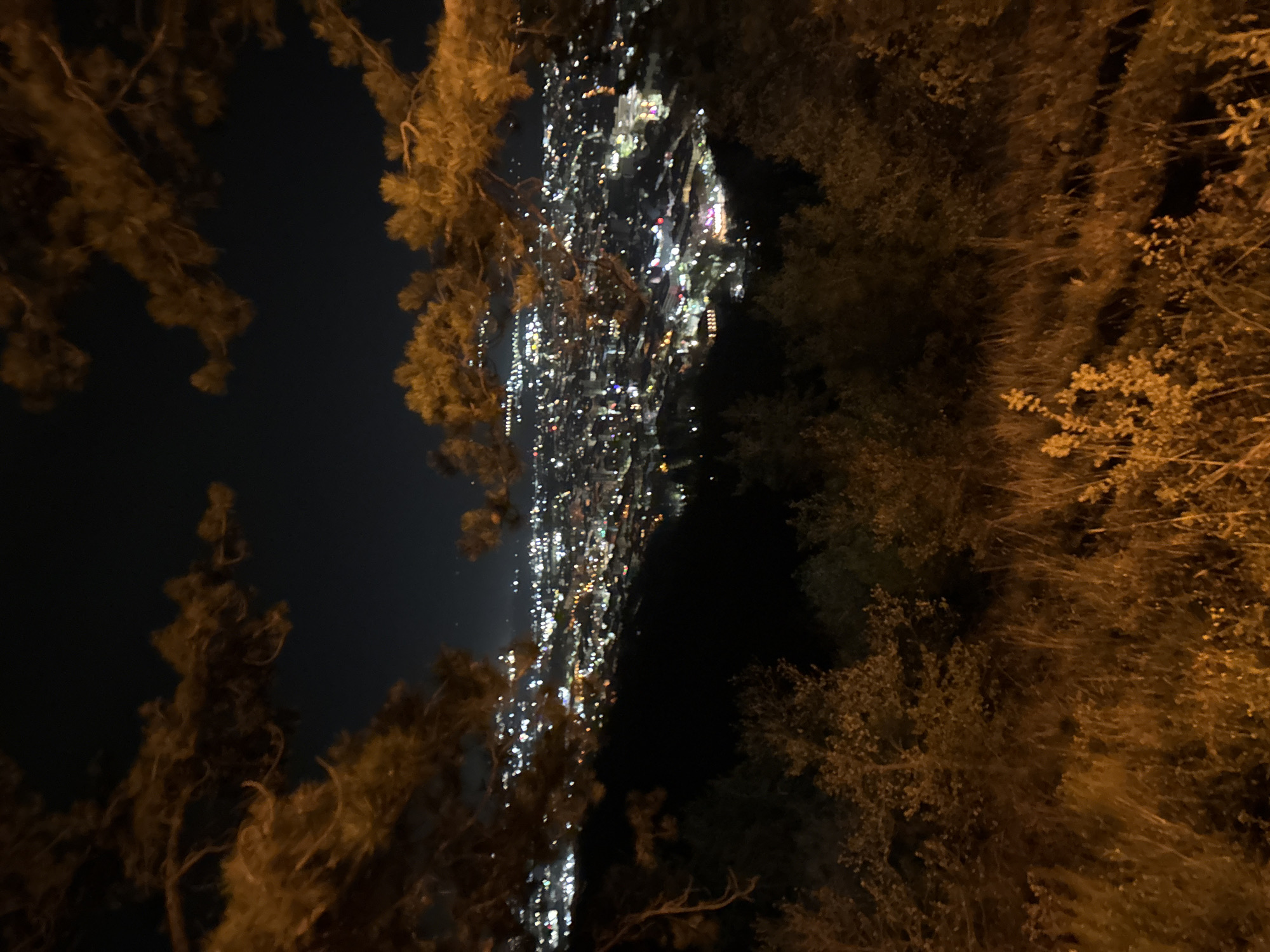 A nighttime view shows a city illuminated with countless lights, appearing like a sparkling river flowing through darkness. Trees and foliage frame the cityscape on both sides. The left side of the image reveals a dark night sky partially visible behind the branches. The right side features denser foliage, creating a contrasting backdrop to the bright city below.