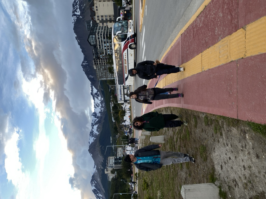 Four people stand on a red and yellow striped path with snowy mountains and a bus in the background