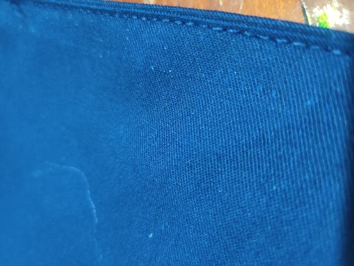 A close-up, static image presents a section of dark blue textile fabric. The fabric displays a visible woven texture, minor surface pilling, and an irregular, lighter-toned, dried residue mark on its upper-left quadrant. A machine-stitched seam, with matching dark blue thread, is visible along the right vertical edge. The textile rests against a blurred, light brown surface, likely wood, which also contains indistinct green and yellow coloration elements, visible on the far right. No individuals, actions, or specific environmental context are discernible to determine a precise location in the city of Unknown, Unknown.