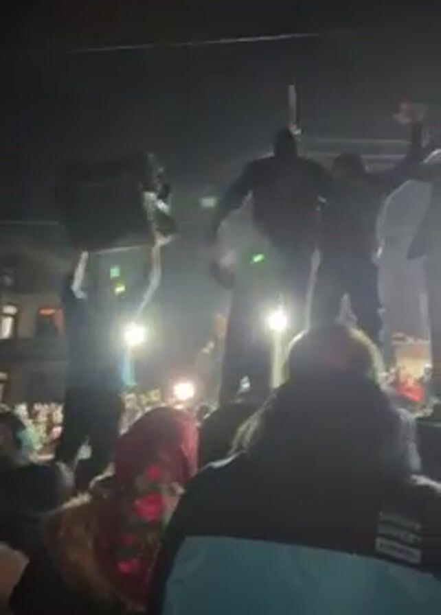 At night, a crowd of people is gathered in an outdoor space. Some individuals stand on top of a vehicle, gesturing with their arms. One person raises a large, black, rectangular object above their head. Streetlights illuminate the scene, casting shadows of the people onto the crowd below.