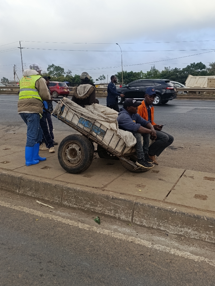 A group of men are standing and sitting by a hand-pulled cart on a paved sidewalk. One man wears a bright yellow vest and blue boots. Two men are seated on the cart; one wears a blue jacket and a black baseball cap, while the other sports an orange jacket. Cars are visible driving on the adjacent road, with trees and buildings in the background under a cloudy sky.