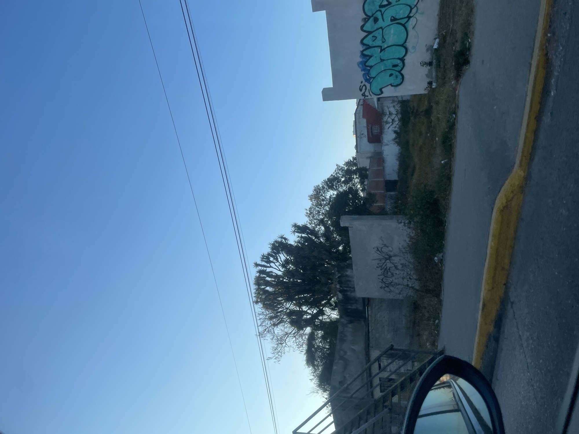 The image depicts an outdoor urban environment in Casa Blanca, Mexico, viewed from the perspective of a vehicle. The upper half of the frame is a clear, bright blue sky, traversed horizontally by two parallel dark utility lines. In the lower left foreground, the black frame and reflective surface of a vehicle's side mirror are visible. The lower middle ground features dark asphalt pavement, bordered by a distinct yellow painted concrete curb. Beyond the curb, an unpaved strip of ground is covered with dry grass, weeds, and scattered white debris. To the left, a dark metal staircase with railings ascends diagonally, adjacent to a weathered concrete wall. Behind this wall, a large, multi-branched tree with dark, spiky, succulent-like foliage stands prominently, flanked by other trees with sparser leaves. To the right, a light-colored concrete wall displays extensive teal-blue bubble letter graffiti, with additional black text including "AS" visible beneath it. Behind this wall, several residential or commercial structures are partially visible, one featuring a red-painted section and another with a visible barred window. No individuals or specific actions are discernible within the frame.