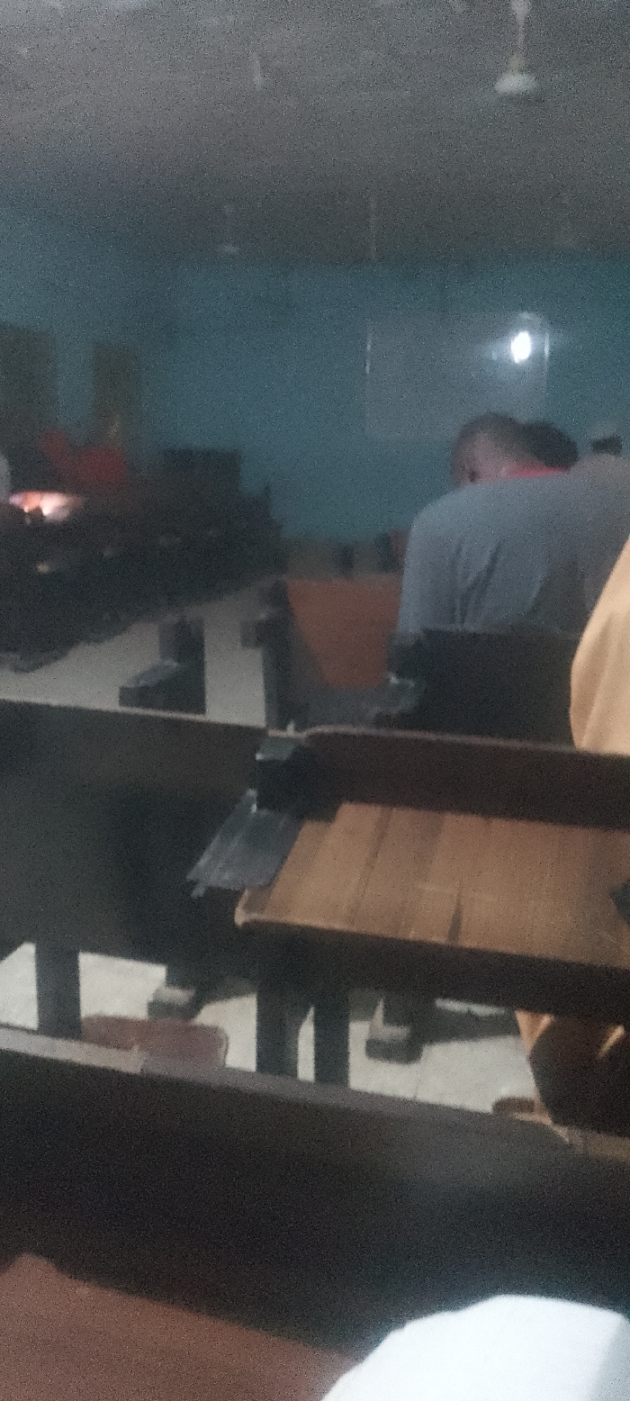Inside what appears to be a classroom or meeting space, desks fill the frame. A few people occupy some seats, with one wearing a gray shirt being the most prominent. The room has a bluish wall and indistinct lighting. The desks are wooden, and the overall atmosphere is dim and grainy.