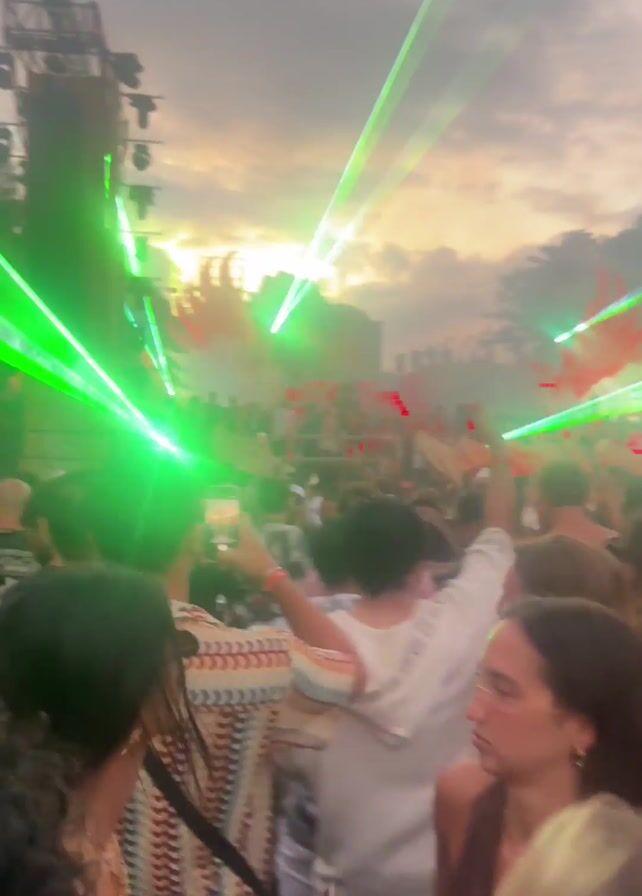 dense crowd of people at an outdoor music festival during what appears to be sunset or dusk, as the sky is partly cloudy with hints of orange light. Green and red laser beams shoot across the crowd and toward the stage, enhancing the festive atmosphere. People are facing the stage, with some individuals raising their arms or holding up phones to record the performance. The crowd is mostly young adults, dressed casually. The stage is visible in the background, suggesting a large-scale event. Several speaker towers are visible on either side of the stage. The overall mood is energetic and celebratory.