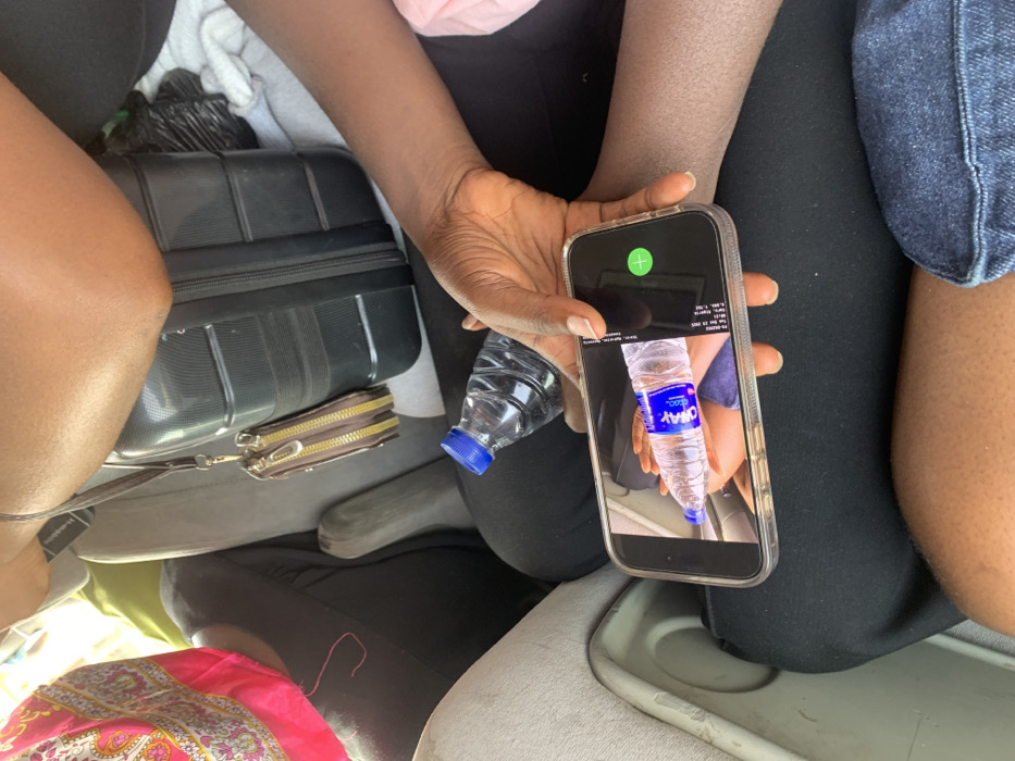 The scene depicts the interior of a vehicle in Keffi, Nigeria, observed from a slightly elevated perspective. In the foreground, a dark-skinned individual's right hand holds a silver-cased smartphone horizontally. The phone's screen displays a vertically oriented image of a clear plastic bottle of "ORAY Pure Water" being held by a hand, with partial overlay text showing "Nov 03 2023" and numerical data. To the immediate left of the smartphone, a clear plastic bottle with a blue cap, partially filled with water, rests on a dark surface. Further left, a passenger is partially visible, wearing a pink and white patterned head covering and dark clothing. A dark-skinned arm is visible to the right of the smartphone. Between passengers, a small, dark grey hardshell suitcase is positioned, with a brown zippered pouch attached via a strap. A black plastic bag is partially discernible behind the suitcase. The vehicle's interior features grey fabric seating.