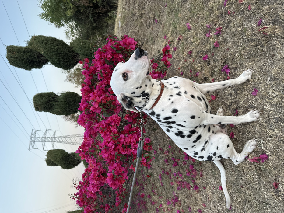 A Dalmatian dog is lying on the grass, with its head tilted up. The dog has a brown collar and is attached to a leash. Behind the dog is a vibrant pink flowering bush, and to the left of the bush are sculpted green bushes near a tall power line structure. The ground is covered in dry grass and scattered pink flower petals.