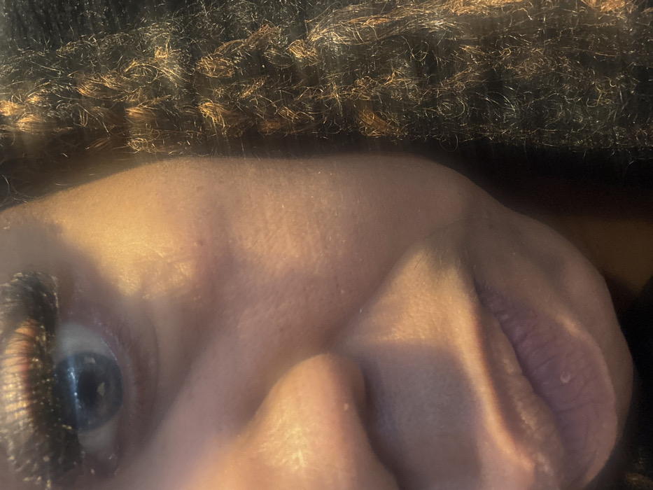 The image displays a close-up, angled view of the right side of an individual's face, located in Oberhausbergen, France. The subject exhibits skin with a visible texture and a luminous sheen, suggesting direct lighting. The right eye is prominent, featuring a blue iris and dark eyelashes. Below the eye, the bridge and nostril of the nose are partially visible. The upper lip and a segment of the lower lip are shown, with a small, light-colored nodule present on the lower lip. To the right of the face, dark, tightly coiled hair with distinct brown or reddish-brown highlights is visible. No explicit actions or interactions are depicted.