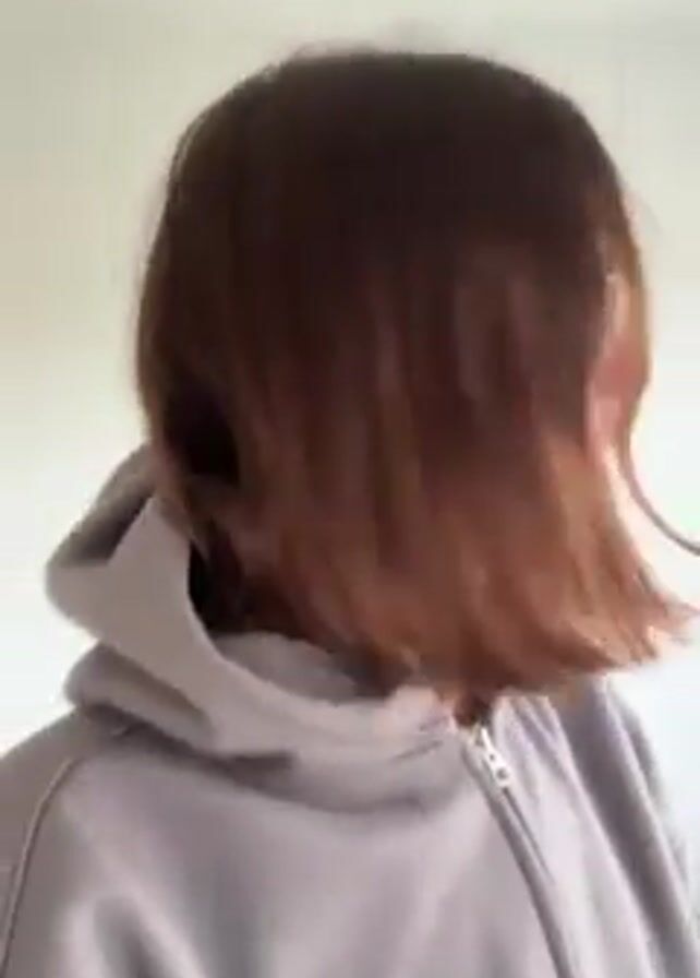 A person with shoulder-length brown hair and glasses, wearing a gray zippered hoodie, looks at the camera with a pouting expression. They hold their hands to their face, resting their cheeks in their palms, and the background shows white tiled walls.