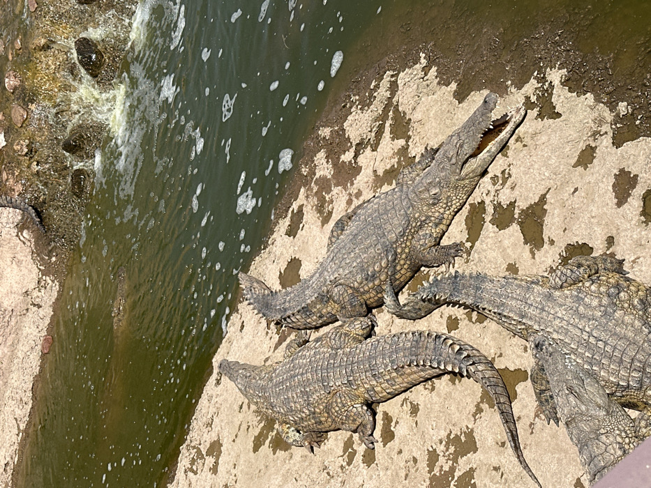 The image depicts a crowded crocodile enclosure within the city of Drarga, Morocco