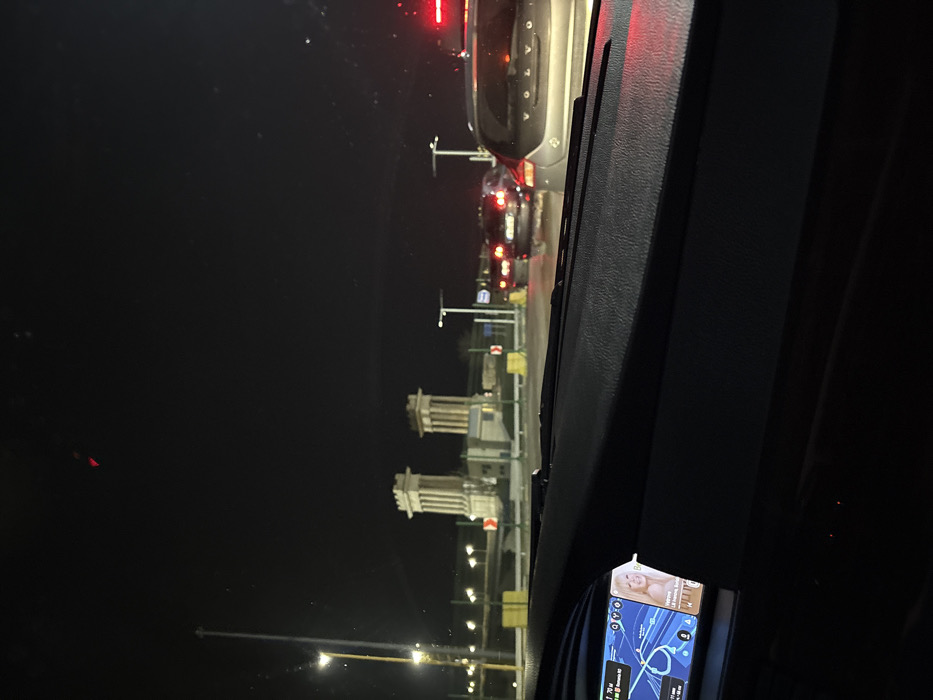 The image depicts a nighttime scene from inside a vehicle, likely stationary or moving slowly in traffic