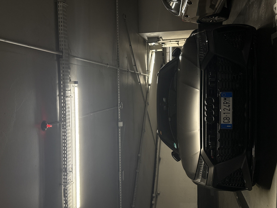 A dark gray Audi, license plate CB-124RM, is parked in a dimly lit garage. The front of the car is visible, showcasing its distinctive grille and headlights. Industrial elements like metal conduits, cable trays, and fluorescent lights line the walls. A red circular object stands out near one of the lights. Another vehicle is partially visible in the background.