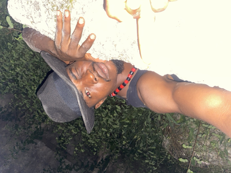 A man wearing a black fedora poses in an outdoor setting. He is holding onto a light-colored stone structure with his right hand. He has a goatee and wears a black and red beaded necklace. The man is looking slightly to the left of the camera with an intense expression. Lush green foliage surrounds him, and the overall lighting of the image is dim.