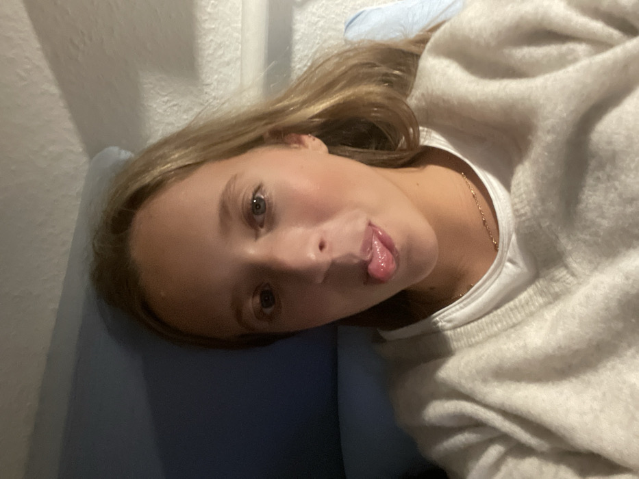 A young female subject is depicted in a close-up, chest-up portrait. She has light brown hair and is looking directly at the camera with her tongue extended from her mouth. She is wearing a light-colored, possibly off-white, knitted sweater over a white crew-neck undershirt, and a thin gold-colored chain necklace is visible around her neck. The background consists of a dark blue, possibly fabric-covered, surface on the left, and a lighter, textured surface, likely a pillow or wall, on the right. The setting appears to be an indoor, dimly lit environment, possibly a bedroom. No specific geographic location, including Cologne, Germany, can be determined from the visual information provided.