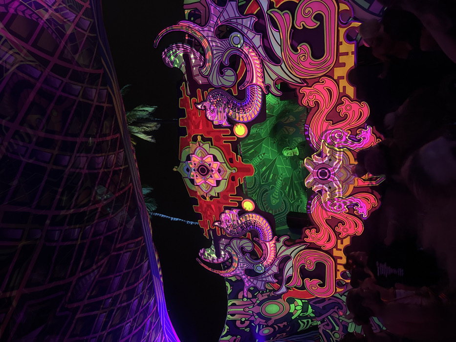 A vibrant, psychedelic scene is dominated by glowing neon art. Intricate patterns of fish-like creatures and floral motifs are rendered in shades of pink, purple, green, and orange. A geometric structure in purple hues stands to the left, contrasting with the dark background. A few palm trees are visible in the distance. The right edge of the frame shows blurred figures of people, adding a sense of depth and scale.
