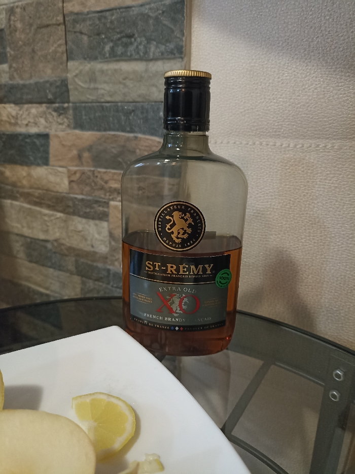 An indoor scene displays a half-full clear glass bottle of "ST-RÉMY Extra Old XO FRENCH BRANDY," topped with a black and gold cap, resting on a dark, reflective glass table