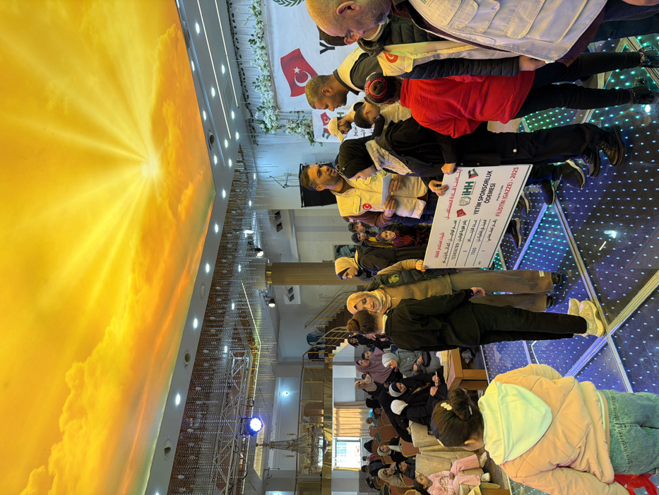 The image depicts an indoor event within a large hall in an unknown location in the city of Gaza. The central activity occurs on a multi-paneled, illuminated glass floor that emits blue and green light. A group of individuals stands on this illuminated floor. From left to right in the foreground: a young girl in a pink top and blue jeans, with her back to the camera; a woman in a black long-sleeved top, black pants, and white sneakers, facing away from the camera; a woman in a beige hijab, olive-green vest over a brown top, and brown wide-leg pants, speaking to the woman in black. To their right, a man in a beige vest with a visible Turkish flag patch and "IHH" logo on his left chest pocket holds white papers and converses with a woman in a black hijab and dark coat. This woman, along with another individual mostly obscured, holds a large white banner resembling an oversized check. The banner displays text in both Arabic and Turkish, prominently featuring the "IHH" logo and a Turkish flag. Key legible phrases include "YETİM SPONSORLUK ÖDEMESİ" (Orphan Sponsorship Payment) and "FİLİSTİN (GAZZE) - 2023". Amounts such as "1500" (شهرياً - monthly) and "18000" (سنوياً - annually) are visible. In the background to the left, an audience, primarily composed of women, many wearing hijabs, and some children, is seated in rows of chairs. A staircase leads to an upper level or balcony, which also appears to have seating. A large, ornate chandelier hangs on the left side of the hall. The ceiling features a large, curved illuminated mural depicting a vibrant orange and yellow sky with clouds and radiating sunbeams. Decorative light fixtures with hanging crystal or bead strands are suspended from the ceiling. To the right in the background, a white backdrop decorated with white floral arrangements and a green banner featuring Arabic text and a small Turkish flag is visible. The man on the far right of the frame is partially visible, wearing a beige vest similar to the central male figure.